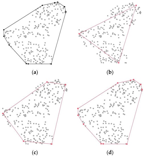 The experienced reader will have noticed that the number of archetypes p to be considered is fundamental; in fact, if p = 703 the solution to the problem posed is trivial, since the sum is minimised (in fact, it gives zero) when the archetypes are and 1, 0 if . This leads us to comment on some interesting geometrical deductions [4]. Although our data are in , the deductions will be explained for the case of the plane, where they are easier to visualise. Given a set of points in the plane, its convex envelope is defined as the convex polygon of minimum area covering all points (i.e., all points are inside the polygon). The archetypes are always inside the convex envelope of the set of points. Moreover, if the polygon defining the convex envelope has q vertices, and we are looking for a number of archetypes p = q, then the archetypes are precisely the vertices of the convex envelope. In Figure 1, we see what happens as the number of archetypes approaches the number of vertices of the convex envelope. In Figure 1a, we have a dataset in the plane and its convex envelope. In Figure 1b, we have the data, together with p = 3 archetypes and the polygon they define. In Figure 1c, we have the data and p = 5 archetypes. In Figure 1d, we have the data and p = 10 archetypes, which coincide with the vertices of the convex envelope.
