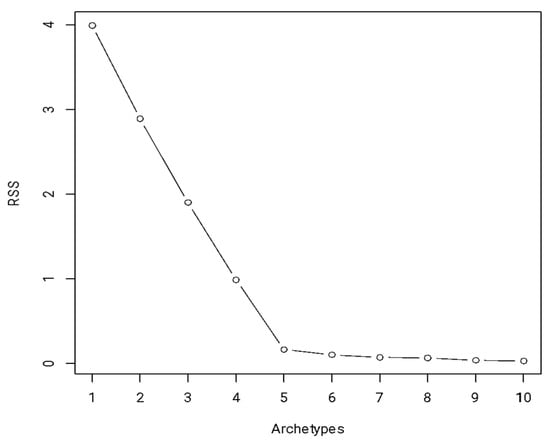 In Figure 2, the minimum value (RSS(p)) of Equation (1) is plotted as a function of the number of archetypes p considered. It can be seen that, for our 703 standardised data, at the value p = 5, we have what is called an elbow, and from the number of archetypes p = 5, the value of RSS(p) remains ‘stable’; therefore, we select p = 5 as the ideal number of archetypes.