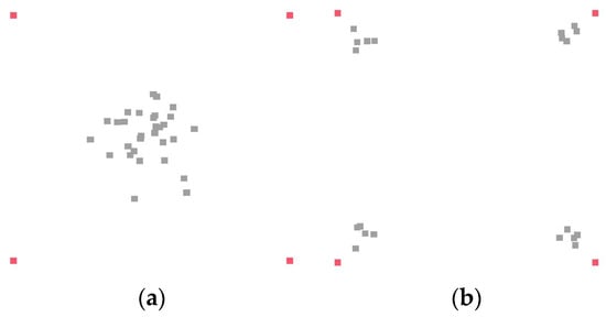 That is, each datum , which in our case represents one of the 703 people participating in the survey, is expressed as a mixture of the p archetypes. Moreover, as the values of are between 0 and 1, it is easy to explain the weight of each archetype in percentages. In Figure 3, we have two datasets that are represented by the same four archetypes. In Figure 3a, all archetypes have a significant weight in the sum, i.e., the coefficients have a similar value for the points in the central cloud. In Figure 3b, each datum is practically explained by one archetype, i.e., one value of is close to 1 and the rest are close to zero.