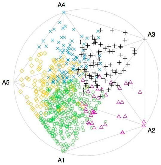 This way of assigning each datum to the archetype group, for which the value of the coefficient is largest, does not distinguish between very different situations as depicted in Figure 3. Since our data are in , to obtain an idea of each coefficient’s weight in the representation, we will conduct an indicative geometric visualisation based on two orthogonal projections. First, we project the data onto the convex envelope formed by the archetypes; then, we project the new points onto a plane [28]. Obviously, the result of the projection depends on the plane; thus, the visualisation is only indicative. Figure 4 shows the result of this projection; the colour (and shape) of the points relates the projected points to the group to which the original data belong. points are the projections of the archetypes