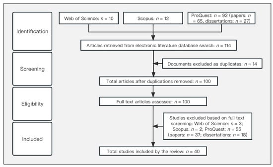 The study used a checklist and a flow diagram from PRISMA guidelines (Preferred Reporting Items for Systematic Reviews and Meta Analyses) to help us improve the quality of systematic reviews. Based on the PRISMA statement, we constructed the procedures for the literature search and selection (see Figure 1). In the three databases, the study searched 114 related articles in total, including 14 duplicates. After duplicate removal, the 100 articles were downloaded in full and screened independently by two researchers on the research team. The first author of this study made the final decision on the different opinions generated in the process. Sixty studies were excluded because they did not meet the selection criteria. The main reason is that in these studies, Roblox did not have any connection with learning. For example, there is a study taking Roblox as an example to discuss the development opportunities for the food retail industry in the Metaverse []. This kind of research is excluded because it has neither a learner involved in Roblox nor does it use Roblox as a learning case. Finally, 40 papers were analyzed to answer the four research questions of this study. The researchers read and analyzed these 40 articles thoroughly. The coding scheme aimed to ensure that the study did not miss relevant information to answer the RQs. In addition, the study adapted the suggested coding categories for the types of focus on theme with a narrow scope []. The coding scheme of the present study included context, participants, aims and scopes, key functionalities, and key findings.
