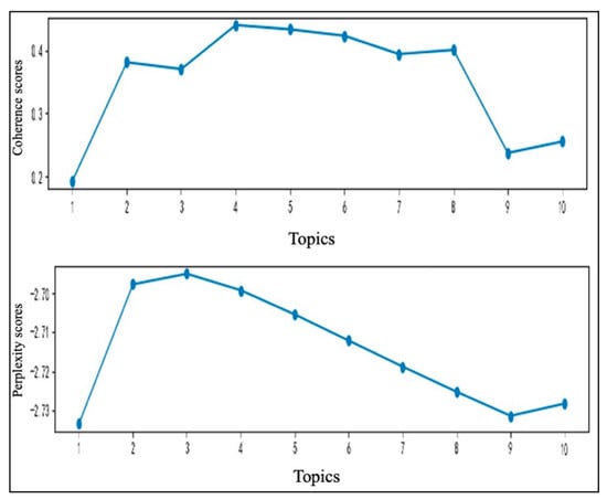 At the same time, latent Dirichlet allocation (LDA) topic modeling, coherence scores, and perplexity scores were conducted for the abstracts of these 40 studies to help the study analyze and elaborate research themes and trends. In the field of natural language processing, topic modeling is widely used in text clustering and topic detection and evolution []. LDA is a document theme generation model, and the unsupervised LDA model can obtain the topic distribution. It can cluster by calculating the similarities between themes and trends, which has obvious advantages in the calculation accuracy and clustering effect []. The study analyzed the abstracts of 40 articles in total. Because these data cannot be applied to topic modeling directly, we cleaned the data first: (1) stop words, such as “the”, “a”, “by” and “through”, were removed; and (2) single roots for many words were filtered out. Some words have similar meanings, but the computer confirmed that they were different words, such as student and students. (3) Some words that appear in the abstract frequently but do not play a significant role in topic classification were removed, such as “this research” and “the study”. Subsequently, the study calculated the coherence scores and perplexity scores (as shown in Figure 2), which could be used to determine the optimal topic. For this research, six topics were selected to model the topics of these studies, and the Python Gensim Library was used to conduct LDA topic modeling, forming the probability distribution of topic words (as shown in Table 1). The researchers read and summarized the selected articles in full. The purpose of using topic modeling is to help the researchers analyze data more comprehensively and provide corresponding support.