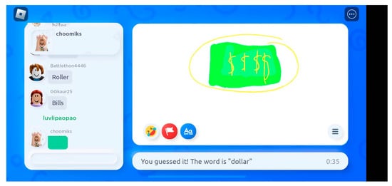 Social interactive learning in Roblox is an important embodiment of how Roblox applies to learning, which acts in cooperation with Topic 4 in LDA topic modeling. In this topic, the most commonly used words representing social interactive learning were “Social”, “Child”, “Use”, “Education”, “Metaverse”, “Student”, and “Digital”. Some research notes that Roblox provides a new way for learners to socialize [,]. First, the functions of Roblox can support learners’ social interaction and collaborative learning (Figure 3 as an example). Roblox has simple hardware requirements, and it does not require a pressure sensor or tactile versatility []. Since Roblox supports text and voice communication [], it is convenient for learners to collaborate. Han et al. [] pointed out that task settings in Roblox emphasize challenges and cooperation, so learners must cooperate to successfully complete a task. In Roblox, learners can interact with other users and environmental factors and compete with peers. These factors enhance users’ interactive experience, motivation and interest and promote sustainable learning [].