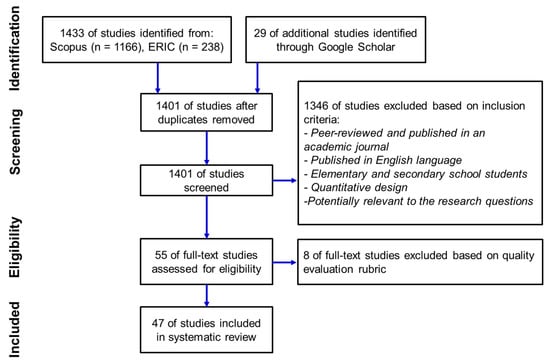 In the fourth phase, a total of 55 potentially eligible studies were retained for full-text screening. A study quality evaluation rubric designed by Margot and Kettler was used to examine the full text of the study in terms of the following aspects: (1) objectives and purposes, (2) literature review, (3) theoretical framework, (4) participants, (5) methods, (6) results and conclusions, and (7) implications [41]. Each of the seven criteria was scored on a four-point scale, where 1 = Does Not Meet Standard, 2 = Nearly Meets Standard, 3 = Meets Standard, and 4 = Exceeds Standard [41]. Articles that had a total score equal to or less than 14 points were excluded [41]. To avoid bias in the fourth phase, both LHC and NVH authors worked independently to score 55 potentially eligible studies. We agreed on 43 out of 55 studies with scores greater than 14 points. Traditionally, we calculated “interrater reliability” using a percent agreement [42]. The calculated agreement rate was 0.78. We then held a meeting to score the remaining 12 studies until we reached an agreement for this work. Finally, we added 2 eligible studies. After assessing study quality, 8 studies were excluded, and 47 studies were retained for inclusion in the review.