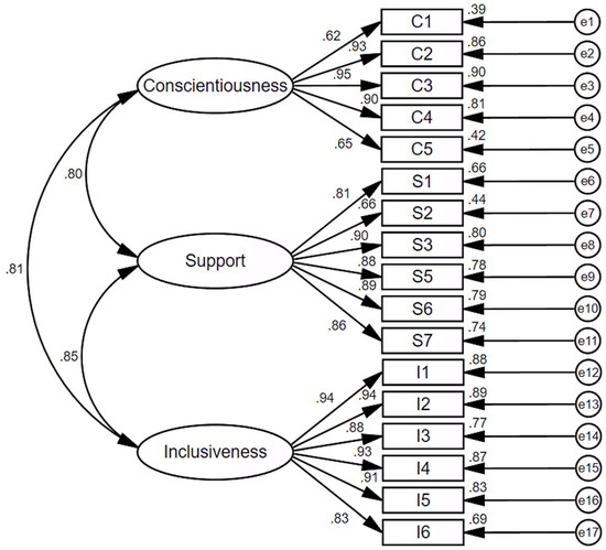 In order to test the theoretical foundation of the scale, we performed CFA with the original three subscales (i.e., Inclusiveness, Support, and Conscientiousness). According to the test results of initial model fitness, the values of AGFI, RMSEA, and NFI do not meet the fitting criteria, indicating that the initial model needs to be revised. We mainly followed two criteria when revising the measurement model. First, based on the suggestions proposed by Hair et al. [44], items with factor loading less than 0.5 and SMC value less than 0.36 were deleted to improve the model fitness. Second, Landis et al. [45] suggested that the items related to residuals should be deleted by observing the modified index (MI) and Par Change on the premise of ensuring the number of items. According to the correction index (MI) and Par Change in output results of Amos24.0, we deleted the S4 and I7 items with strong correlations with other measured variables and re-ran the program. The specific results are shown in Table 4. It was found that the values of both AGFI and NFI met the fitting criteria. RMSEA was greater than 0.08 but less than 0.1, indicating that the fitting degree of teachers’ caring behavior in online teaching as a three-factor concept is acceptable [41]. The analysis results are shown in Figure 1.