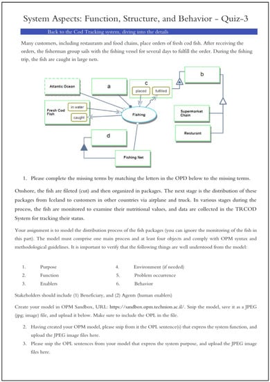To prepare the participants for developing their tasks, we developed four food-related online assignments containing short videos, photos, text segments, and OPM models, with each assignment consisting of a questionnaire and a quiz. The first assignment, for example, was in the context of chocolate production, followed by a quiz on cod fish processing. The content of the entire learning process and an example from the third online assignment are presented in Table 1 and Figure 1, respectively. This learning process is described in more detail by Akiri and colleagues [12], who concluded that this process is useful in endowing students with the basics of systems thinking and conceptual modeling in a relatively short intervention. We applied this finding in the current research.