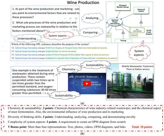 The sustainability task aspect was wastewater treatment in the wine industry, integrated with the chemical oxygen demand (COD) index—an indication of wastewater toxicity. While not included in the OPM model, these sustainability and chemistry aspects were linked to it in a relevant way, with questions that reflected wine production as the contextual common thread, requiring different thinking skills to respond.