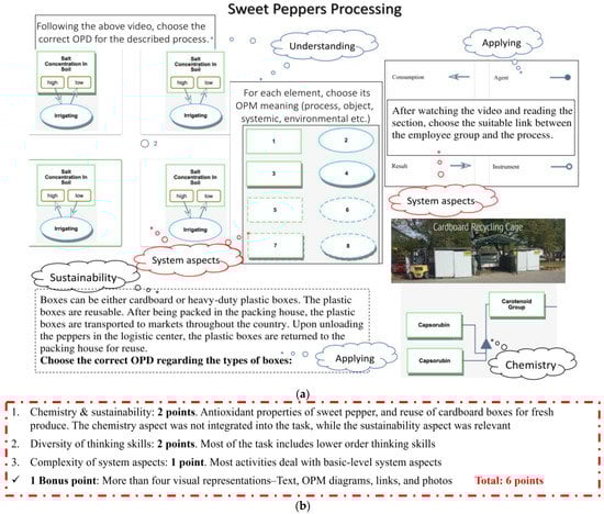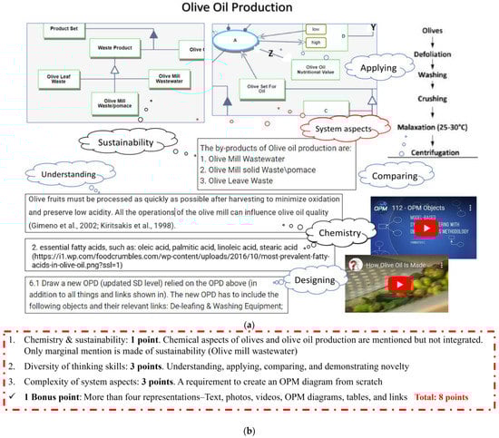 Her task has ample, carefully selected, and highly relevant flowcharts, figures, photos, illustrations, videos, tables, and conceptual models. Sustainability was included in the OPM model within the task, but not as an integral part pedagogically: no question referred to the OPM model (Figure 3), and there was no need to extract information from it regarding the sustainability aspect—olive mill wastewater. As shown in Figure 4, two points were taken off her task grade since the combination of sustainability and chemistry could have been more integrative and more prominent.