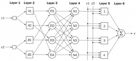 Fuzzy logic systems require an external system to set and modify their settings, since they lack the capacity for learning and the adaptability of neural networks. Although they can learn from an input, neural networks are opaque because the weights of the connections between their neurons store the information used in their reasoning [53]. The adaptive neuro-fuzzy inference system (ANFIS) is an intelligent system architecture that combines the advantages of neural networks and fuzzy logic principles in a single framework. ANFIS is an artificial neural network based on the Takagi–Sugeno inference system [10]. The function of the inference system is to produce an approximative output, and the task of the neural network component is to estimate the fuzzy rules’ membership function parameters from the input and output samples [10,11]. Figure 1 illustrates the ANFIS architecture.