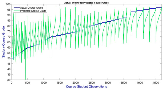 The CG dataset was divided into two subsets for training and testing, with training making up 70% of the whole. To avoid overfitting, the model was trained using k-fold cross-validation with k = 5. An RMSE of 9.3 was observed in the model’s values predicted using testing data. As a result, the model’s accuracy for the test data was 90.62%. Figure 2 shows that the model captures the functional link between the course grade as a target variable and the input factors looked at in this study. The model is then used to observe how each input variable affected the determination of the course grade in the subsequent steps.