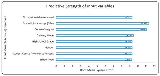 Backward elimination is a method that is frequently used to evaluate the relative prediction power of an input variable [58]. All input variables were initially used to train the ANFIS model, and the appropriate RMSE was calculated using the testing data. Subsequently, the model was retrained using the same testing data after eliminating each input variable one at a time and observing the change in RMSE. The percentage of the predictive influence of a given input predictor is inversely correlated with the magnitude of the change in the RMSE that results from the removal of that predictor [58]. In Figure 3, the RMSE that results from eliminating one input variable at a time as a predictor is shown as the value on the accompanying horizontal bar. Contrast this value with the RMSE value shown on the top bar (no input variable removed). The change quantifies how much the RMSE has increased due to dropping that input as a predictor, demonstrating its predictive power. As can be observed in Figure 3, GPA is the most important predictor, followed by course category. The effects of the remaining predictors are almost equal.