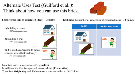 For example, Wilson et al. [32] hypothesized that creativity could be divided into factors and was composed of those factors. Based on those hypotheses, Guilford et al. [33] created the Alternate Uses Test, which measures creativity by factor. This test was used to determine the following four factors: Fluency, which is the overall sum of generated uses; Originality, which is the statistical rarity of generated uses; Flexibility, which is the number of conceptual categories of generated uses; and Elaboration, which is the degree of detail [33,37]. An example of the content of this test is to think of uses for bricks (see Figure 2). Suppose the respondent considers three ideas: “building a house,” “building a wall,” and “it is used as a weapon to defeat enemies who attack suddenly.” In that case, Fluency would have 3 points. In addition, since two categories are created, build and use for weapons, Flexibility would have 2 points. Furthermore, points for Originality would be added for the idea that it is statistically rare on a relative basis. Moreover, points for Elaboration would be added for the highly detailed idea.