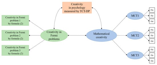 In summary, while there are few empirical studies on the relationship between Fermi problems and creativity, this study provided several insights. However, this study had limitations. As noted in the literature review, there are various ways to measure creativity in psychology. Therefore, analyses using creativity tests not used in this study may lead to different results. For example, there are creativity tests in psychology that focus on linguistic ability, such as finding commonalities among several words. If the results of such creativity tests are used, it is conceivable that the results would differ from the results of this study because of the influence of language ability. Additionally, when measuring creativity in Fermi problems, our analysis did not include in its evaluation perspectives that are likely to be influenced by mathematical ability, such as the correctness of mathematical processing or what formulas were used. Therefore, this study did not consider influences related to mathematical ability. Previous studies have shown a correlation between mathematical creativity and mathematical ability [9,42]. Furthermore, since Fermi problems are treated as mathematical estimation problems, it is impossible to say that mathematical ability is not influenced completely. Therefore, the following formula, which also considers mathematical abilities, needs to be considered: