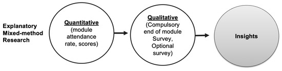 The mixed methods approach was used in this study, which involves the use of both quantitative and qualitative approaches. The explanatory mixed method research employed in this study started with collecting and analysing quantitative data. This was followed by a qualitative data gathering to learn and explain more about the context behind the figures through surveys, focus groups, etc., as illustrated in Figure 2). Explanatory mixed method research integrates all of the findings for a broader and deeper understanding of the study participants. In this context, the study intended to better understand the perception of the participants in the experimental group to assess the impact of game-based learning methods on the various quantitative data gathered such as module attendance and the module score. This research design is especially useful when there is a need to explain and interpret quantitative findings. Quantitative research is flexible and allows one to collect data on different phenomena that is usually not in qualitative form such as attitudes and opinions, but can be converted to quantitative data, which makes it easier to analyse the data statistically. Qualitative research uses a systematic and rigorous approach that aims to answer questions concerned with what something is like, in our context student experience, and what students think or feel about something that they were exposed to, and it may address why something has happened as it has. Qualitative data often take the form of words or text and can include images. In our study, we captured qualitative data through a compulsory end of module survey and an optional survey for the experimental group. Qualitative research covers a very broad range of philosophical underpinnings and methodological approaches [81]. The positivist believes that the knowledge is universal and absolute, and based on their knowledge claim, positivists adopt the quantitative method to state reality in the world, whereas constructivists espouse a qualitative method to construct the meaning of the phenomena under investigation.