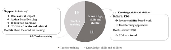 The whole-systems-thinking of the subject—category 1.1.—refers to the set of ideas linked to the cognitive profile that makes up the university teacher on ESD. Indicator 1.1.1.—knowledge, skills and abilities– refers to the teacher’s set of skills for the development of ESD. Indicator 1.1.2.—teacher training–refers to the need to train teachers for ESD development.