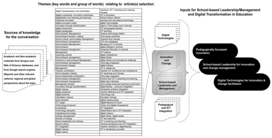 The 250 papers were further screened using very specific key works, with emphasis on the words and group of words strongly relative to the objective of the current article; for instance, articles addressing “technology innovation in schools”, and/or “school-based management to digital innovation”, etc. (see Figure 2). This bought the selected papers/documents/books to a total of ninety-one (91). The 91 selected publications were further clustered into the contexts of how they address the subject matter of the conversation (school innovation issues from technology and pedagogical perspectives, and how they portray school-based management of digital innovations). The 91 selected publications (both peer-reviewed and non-academic) were subjected to further content analysis to ensure that the papers extracted offer relevant inputs to the questions guiding this current article. Figure 2 offers an illustration of the process followed to extract the DTE focal themes, which are (i) pedagogically focused innovation, (ii) school-based leadership for innovation and change management, and (iii) digital technologies for innovation and change facilitation.