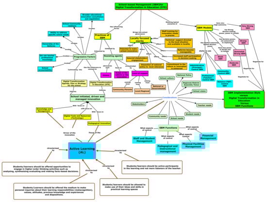 In the context of the reviewed papers, we present the results as the position of the authors to ideate for school-based digital transformation. This paper is underpinned by two main conceptual and theoretical bases: (i) Michael Fullan’s concept of School innovation based on three key factors of Technology, Pedagogy, and Change Knowledge [39,58,59]. Fullan’s innovative pedagogy is extended with AL from the works of Bonwell and Eison, as well as Chickering and Ehrmaan’s [45,49] Active Learning thought. (ii) The concept of school-based management and its related indicator elements, actors, and processes for the successful accomplishment of activities [50].