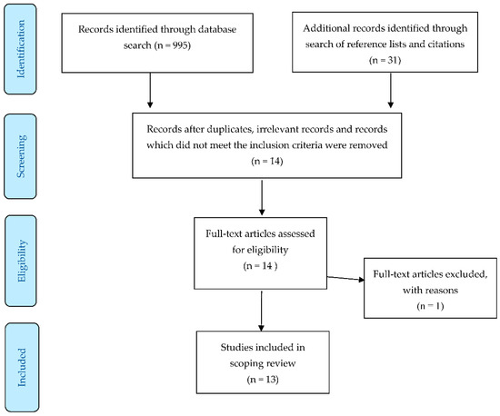 - Peters, M.D.J.; Casey, M.; Tricco, A.C.; Pollock, D.; Munn, Z.; Alexander, L.; McInerney, P.; Godfrey, C.M.; Khalil, H. Updated methodological guidance for the conduct of scoping reviews. JBI Evid. Synth. 2020, 18, 2119–2126. [Google Scholar] [CrossRef]
