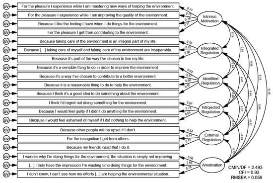 Confirmatory factor analyses reflected the MTES structure as reported in the literature (e.g., [,,]). The data fit the model best when cutting the four lowest loading items (see Table 1), a procedure that has been reported in earlier studies (e.g., []). For amotivation, we dropped “I don’t know. I can’t see what I’m getting out of it”, which was only slightly above Steven’s [] threshold of 0.5 in the original study []. For external regulation, the item “To avoid being criticized”, was excluded. For introjected regulation, the lowest loading item in the original study was “I’d regret not doing something” (β = 0.36), while with our younger participants “Because I would feel bad if I didn’t do anything for the environment” revealed a low factor loading (β = 0.36). For integrated regulation, we excluded “Because being environmentally-conscious has become a fundamental part of who I am”.