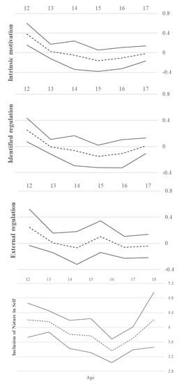 The trajectory of intrinsic motivation, external and identified regulation [], and Inclusion of Nature in Self [], throughout adolescence. Mean scores are depicted by the dashed line, while their 95% confidence intervals are in solid lines (participants in years of age for the MTES: n12 = 44, n13 = 122, n14 = 48, n15 = 51, n16 = 49, and n17 = 92, and for Inclusion of Nature in Self: n12 = 43, n13 = 121, n14 = 47, n15 = 48, n16 = 47, n17 = 90, and n18 = 19).