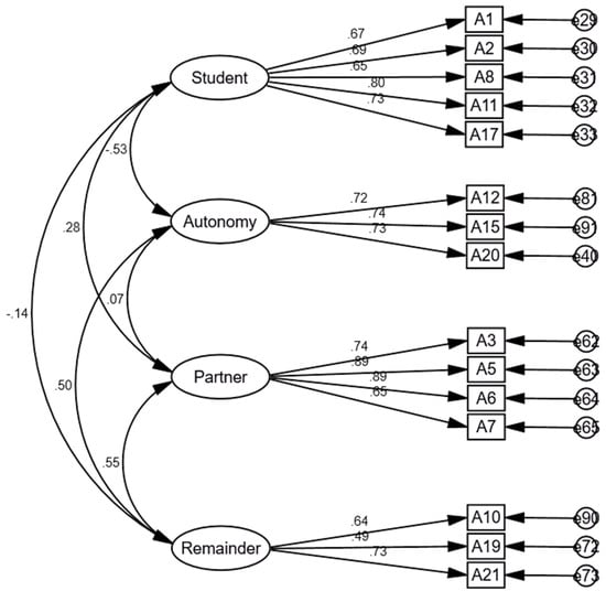 As Figure 1 indicates, all of the observed variables in the 4-factor model are loaded significantly (at <0.01%) on their hypothesized latent factors, with their loading sizes ranging from 0.49 to 0.89. Further, despite the significant chi-square value and the borderline RMSEA value, in general, the model exhibits acceptable fit indices, with its CFI, TLI, and NFI values all exceeding the threshold of 0.90, and the SRMR index reaching below the value of 0.80 [49,50,51].