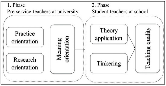 In this study, we investigate whether the connection between research and practice orientation acquired during the first phase of teacher education and theory application and tinkering acquired during the second phase can explain the teaching quality in schools (see Figure 1).
