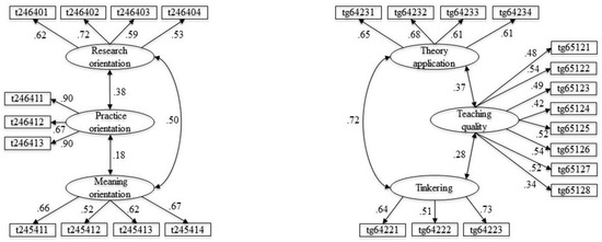 We used the scale on designing conducive learning situations, motivation, and providing transfer options developed by Weresch-Deperrois et al. [74] as an indicator of teaching quality. The measure was performed at the same time as the theory application and tinkering scale. In preparation for the analyses, we calculated the internal consistency of all scales in the first step. Appendice A and Appendice B show Cronbach’s alpha values for internal consistency, which were in the (lower) acceptable range (α = 0.64–0.84) (e.g., [75]). As a second step, we conducted a confirmatory factor analysis to ensure construct validity at all measurement points. The factor loadings are shown in Figure 2 (0.33–0.90). All items were used in the same model, and for clarity, we split the figures for t1 and t2. We interpreted the results to indicate acceptable construct validity for theoretical assumptions about the constructs (e.g., [76]).