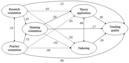 Next, we tested H4 (meaning orientation has a direct effect on theory application and tinkering). The results are shown in Figure 5 and support H4 to some degree. Meaning orientation had a small significant effect on theory application (β = 0.20) but not on tinkering (β = −0.02). Unexpectedly, meaning orientation had a small direct effect on teaching quality.