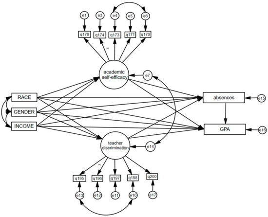 The path diagram for the hypothesized model is depicted in Figure 1 and shows students’ characteristics, teacher discrimination, academic self-efficacy, absences, and GPA. Based on the variance–covariance matrix constructed to model the academic self-efficacy and teacher discrimination, the data were examined to test whether the hypothesized model was a good fit for the data using the maximum likelihood estimation (MLE) function in AMOS 26.
