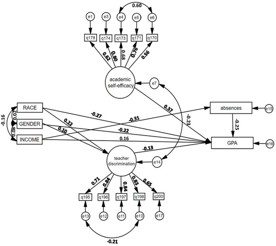 Race, gender, and income had significant direct associations with performance in GPA simultaneously, but the direction of the associations differed. Significant negative direct associations were observed simultaneously among race, gender, and the GPA and indirectly through discrimination in the context of teacher–student relationship: those students who were either African American or male were more likely to have lower GPA scores. While no direct association was observed among race, gender, income, and self-efficacy, a significant negative association was observed between discrimination and self-efficacy when observed through teacher–student interaction. Moreover, self-efficacy was significantly associated with academic performance.