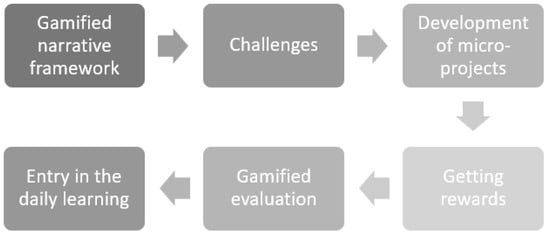- Narrative gamification: This is a strategy that allows students to be introduced to an alternative context to that of the classroom context itself, introducing the learning process in a non-academic narrative [48]. In this way, there is an impact on the reversal of demotivation processes that are sometimes generated by the academic dynamics themselves.