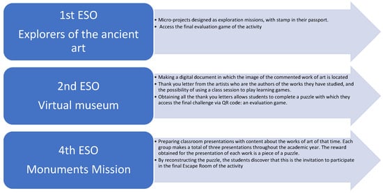 These activities have continuity between the various academic years through the gamification narrative, which connects some experiences with others and contextualizes them appropriately in the historical period studied in each academic year. The academic years in which the didactic intervention was developed were the 1st, 2nd and 4th of ESO.