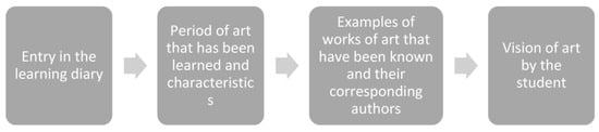 - For the evaluation of the experience, each student opened a learning diary. After each of the missions, they must write an entry in their diary in which three elements appear: Periods of art that have been learned, characteristics of those periods and examples of works and the assessment of art.