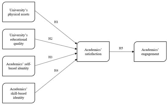 Different research fields on employees’ well-being in a company have highlighted the necessity to enhance the link between satisfaction and engagement [,]. Having employees who are satisfied with the university environment and quality results in the institution to standing out among the competition []. Therefore, given that individuals spend a significant portion of the day at work, the more favorable academics’ perception of their job and working tasks, the greater their engagement with the same []. The positive impact of employees’ satisfaction on their engagement has been extensively proved in the previous literature, including mentions in the higher education sector where academics’ engagement with their job was determined by the level of their general satisfaction with the setting []. Hence, the next hypothesis suggests that:
