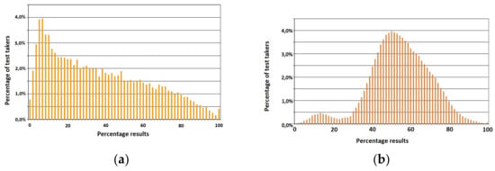 The direct motivation for our actions in introducing elements of interactive teaching into physics is the generally low level of the social perception of this subject (see detailed discussion in the previous paper [25]). Moreover, despite the development of new technologies in education, the results of the maturity exams in physics, say in Poland, are really disastrous (see Figure 1a). The majority of students (out of 18.9 thousand) did not obtain a sufficient score (30 points on the 100 points scale): the median was 32% and the dominant result was 7% (!). Note that this is not the case for other subjects (see Figure 1b for the results from the same (2022) year in humanities). The maturity exam scores in Polish literature and language can be summarized as “no student left behind”—a double Gaussian distribution, with only a small part below 30 points.