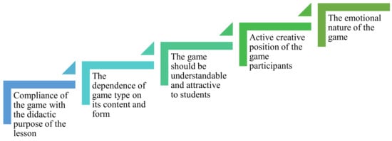 Didactical methods based on games and interactive plays help to develop students’ minds and increase their interest in the lesson. It is known that even children with low interest and lack of effort participate in the lessons mixed with game elements with great enthusiasm and energy. The conditions of organization and conduction of didactic games must contain both clear didactical goals as well as emotionally involve the students; the whole conceptual scheme [41] can be described in the following picture (see Figure 2). As seen from this figure, the keywords in designing educational games are: (i) a clear purpose of the lesson, (ii) simplicity in explanations, (iii) the allowance for creativity, (iv) space for pupils’ emotions.