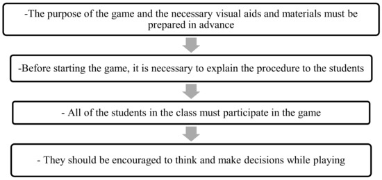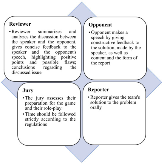 Nowadays, games in education are usually understood as computer-based activities (see other papers in this thematic issue). Knowing this, we came back to the “real” world, in which the games were personal interactions. In particular, role-playing games are widely used in the systems of education, such as teaching specific subjects [9,10,11,12], learning foreign languages [13,14,15,16], and mastering future professions [17,18]. The usage of games in learning illustrates that this method is very easy; it contributes to students’ comprehension and motivates them to improve their knowledge [19,20,21]. During a game, students can recognize themselves in different roles, observe their activity in cooperation [22], develop their memory and critical skills [23], learn to work independently, enrich their vocabulary, and learn to communicate [24].