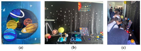 A didactical tunnel as a form of interactive playing with objects: “Ten days on science” at Abai Republican special secondary boarding school in Almaty (January 2023). (a) Students’ vision of the Solar System. (b) Interactive objects to play with. (c) The public is deeply involved in the interactive visiting. The idea, implementation, and photos are by the authors (ZhA and KT).