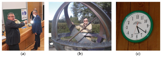 “E pur si muove” (“It moves, however,” attributed to Galileo)—interactive sequence (objects and images) illustrating the rotation of Earth. (a) Constructivist discovery of the relation between Earth’s rotation and the direction “clockwise”, the interactive play at UMK, 22/02/2023. (b) The sun clock (the shadow of the gnomon) moves anticlockwise in Sydney. (c) The “anti-clock” on the wall in an NCU lecture hall. Idea and implementation GK, with help in 7a from Andrzej Karbowski, photos Maria Karwasz.