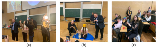 The long-term impact of interactive role-playing and interactive didactical “tunnels” is difficult to quantify; by the very concept, these forms should more induce interest than perform comparative teaching (see [31] for the discussion on the equilibrium between the didactical and ludic functions of interactive didactics). An indirect measure is the spinoffs that our forms trigger. Lessons on interactive astronomy are performed every year at NCU, for the birthday of Copernicus. Similarly, experiments inspired by Galileo’s work in physics and astronomy are part of many of our lessons. In Figure 17, we show two photos from our most recent (22–23 February 2023) rehearsals. Note that these lessons are not free of charge for pupils, and in spite of this the interest is steadily rising. When we started some 15 years ago, we performed these lectures once a year; now, to answer the demand, we need three several-day “slots” in different seasons of the school year.