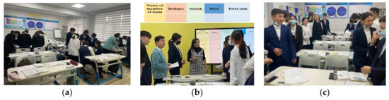 A role-playing game as a competition: “Electric current”. Students of Abai Republican special secondary boarding school for gifted children with extended learning in Kazakh and literature (8V). (a) The class is divided into groups that individually prepare questions for adversaries. (b) The questions are presented and evaluated by the teacher (ZhA, in the center). (c) The individual duels in pairs. Almaty, 2022. Concept, implementation, and photos by the author (ZhA).