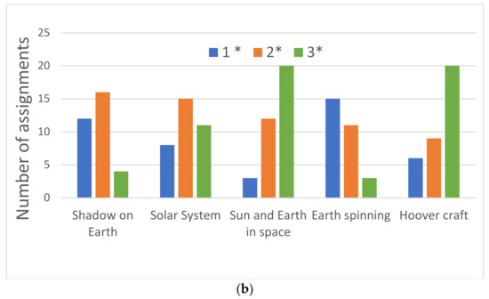 We tested three classes from elementary schools (aged 11–13 years) in Torun and the neighborhood and one secondary class from Torun. Results of the evaluation from a sample of 20 students aged 12 years are given in Figure 15a. As seen from the figure, all experiments attracted the pupils’ attention. Obviously, the most unpredicted (and therefore funny, like a hovercraft) received three stars, but pupils liked also the interactive play, with the three roles, on the Solar System, that can be easily repeated without any equipment. In the secondary school, students appreciated also less “appealing” but more conceptual plays, like those on the Earth and Sun in space (see Figure 15b).