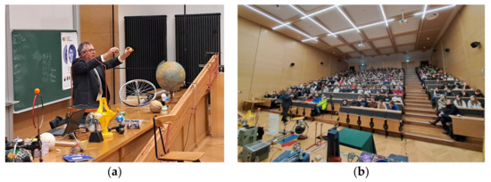 The interest in interactive plays at NCU, in spite of the presence of many science centers in Poland, is steadily rising. In February 2023, in two days some 1600 students from elementary and secondary schools from the whole of Northern Poland came to Torun. (a) The key to the success is interactive experiments (Galileo inclined plane in the first plan, rotating chair, etc.). (b) The most difficult task is to keep the attention of the public for some 60–70 min, to interlace the interactive plays and run scientifically rigorous narration. Concepts and performance GK, photos Kamil Fedus, with permission.
