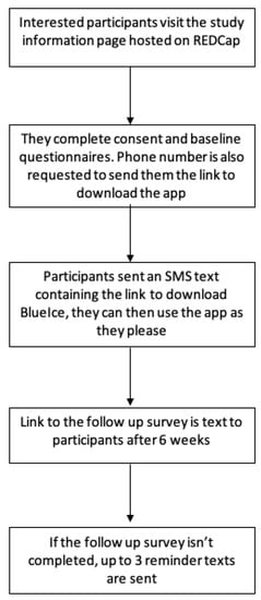 The study procedure and materials were all developed with input from a stakeholder group of university students with experience of self-harm, defined as any thoughts of self-harm or engagement in self-harm behaviours. Once students had consented to participate, they were asked to provide their mobile number to receive an SMS containing the link to download BlueIce. They could choose to receive the follow-up survey via SMS or email. Follow-up surveys were sent six weeks later via an automated process performed by the REDCap software. Participants were sent the link to the follow-up survey up to three times if they did not respond. Please see Figure 1 for a flowchart indicating the study procedure.