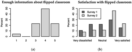 A total of 87 students answered the second survey, while 64 students answered the first (about 74% and 54% of the students, respectively). While 69% of the students who answered the second survey were either satisfied or very satisfied, 20% of the students were either dissatisfied or very dissatisfied, and 11% answered with the more neutral ‘neither satisfied nor dissatisfied (see Figure 2). This was a statistically significant increase from the first survey given in the middle of the flipped classroom weeks, in which 45% were satisfied, 33% dissatisfied and 22% were neutral (p = 0.015 with Mann–Whitney-U-test, effect size = 0.22 (Cliff’s delta)). In the second survey, the students were asked if they felt that they were given enough information on how to study effectively as a flipped classroom student. While 72% of the students felt that they were given enough information to either a large or very large degree, 23% of the students answered with the more neutral ‘to neither large nor small degree’. Only 5% of the students felt that they were not given enough information.