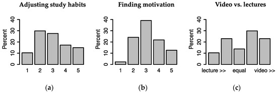 Questions from the second survey. (a) “How difficult did you find it adjusting your study habits to the flipped classroom method?”; (b) “How difficult did you find it finding motivation to work in the theory by yourself?” Alternatives on both (a,b): 5: “Very difficult”, 4: “Difficult”, 3: “A little difficult”, 2: “Not particular difficult”, 1: “Very easy”; (c) “How easy/difficult was it to concentrate on the theory when it was presented in lectures vs. a video?”. Left alternatives: “easier/much easier with lectures”. Right alternatives: “easier/much easier with videos”.