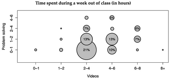 It could also be argued that another weakness with how the flipped classroom was implemented was the large amount of video content that was required for the out-of-class preparation (a common complaint from the students). Based on the study by Guo, Kim and Rubin [31], which found a video length of 6–9 min to be the most engaging, one could argue that the further segmentation of the video content in this study to lower the length of each video could have been beneficial for student satisfaction. However, using a similar methodology as Guo, Kim and Rubin [31] on the video statistics in this study, which has been discussed in more detail in another paper [40], resulted in a video length of 15–25 min rather than 6–9 min. Since the average video length was 13 min, this suggests that the amount of video content was a larger problem than the length of individual videos. While one could on the one hand argue that the time students spent on videos and problem solving out of class each week (Figure 4) was within the amount of work expected by students in higher education, it would probably have been more beneficial to reduce the amount of video content required to be watched before the in-class sessions to reduce frustration and video content fatigue.