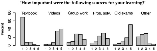 The students were asked to state to what degree different sources were important for their learning of the subjects, such as the videos, group work, fellow students and so on (see Figure 5). Most students found the videos to be important for their learning, as well as studying old exams, with 86% of students answering either ‘important’ or ‘very important’ for both sources. The textbook, on the other hand, was, for most students, not seen as an important source of learning, with 79% of students labelling it as ‘very unimportant’. One student specified how some students might view the textbook:
