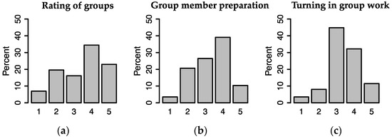 (a) “On the group sessions, I felt that my group functioned:”. Alternatives from “very well” (5) to “very poorly”; (b) “To what degree did the group members come prepared?” Alternatives from “very high degree” (5) to “very little degree” (1); (c) “If you were required to turn in your work at the end of the group session, and that this had to be approved, how would this affect the group work?”. Alternatives from “much better” (5) to “much worse” (1).