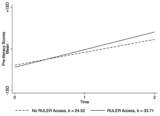 Finally, the conditional growth moderation with random slopes model was run fitting the data statistically significantly better with 27% total variance explained and 20% explained by the fixed effects themselves (see Table 5). Access to RULER was statistically significantly associated with greater early literacy growth in children compared with children in preschools with no access to RULER, γ1001 = 9.21, p < 0.001. Comparison of simple slopes revealed a stronger growth rate in early literacy skills for children in preschools with access to RULER than for children without access to RULER (bRULER Access = 33.71, bNo RULER Access = 24.52, pslopes < 0.001) (see also Figure 1). The end-of-year difference was equivalent to 0.25 standard deviations, 95% CI [0.14, 0.40], which is a small effect using Cohen’s conventions for tightly controlled laboratory studies [82]. Converted to Cohen’s U3, the improvement index was +10, meaning that the average preschooler scoring at the 50th percentile in schools without access to RULER would perform at the 60th percentile had they been in schools with access to RULER.